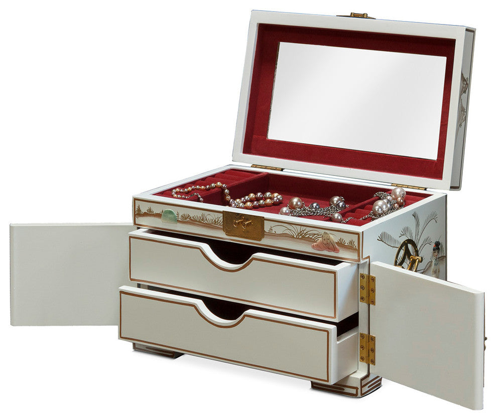 Asian influences transform a room with quiet beauty and serenity. This jewelry chest features hand-painted traditional scenery and mother of pearl dancing lady motif with mirrored lift-top and felt-lined ring trays. 2 doors reveal two felt-lined drawers. Brass hardware. A perfect gift for her. It can be used as a silverware chest as well. Use: Jewelry Box, Storage Material: Wood Color: White, Black, Gold Accents, Mother of Pearl Inlay Make: Hand-crafted, Hand-painted Origin: China Dimensions: W 14"/D 9"/H 10" Weight: 14 lb Attributes: Mirrored Lift Top, Ring Trays, 2 Doors, 2 Drawers, Brass Pulls, People and Figures, Oriental