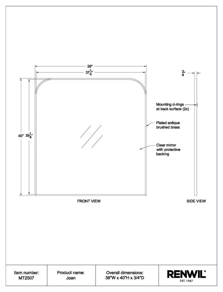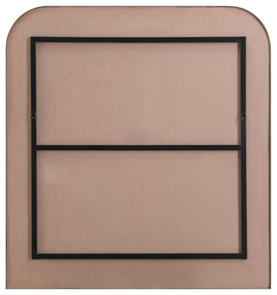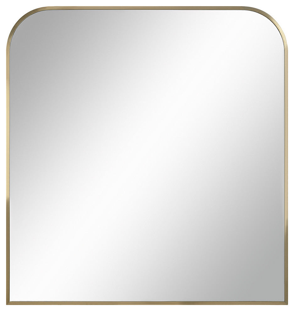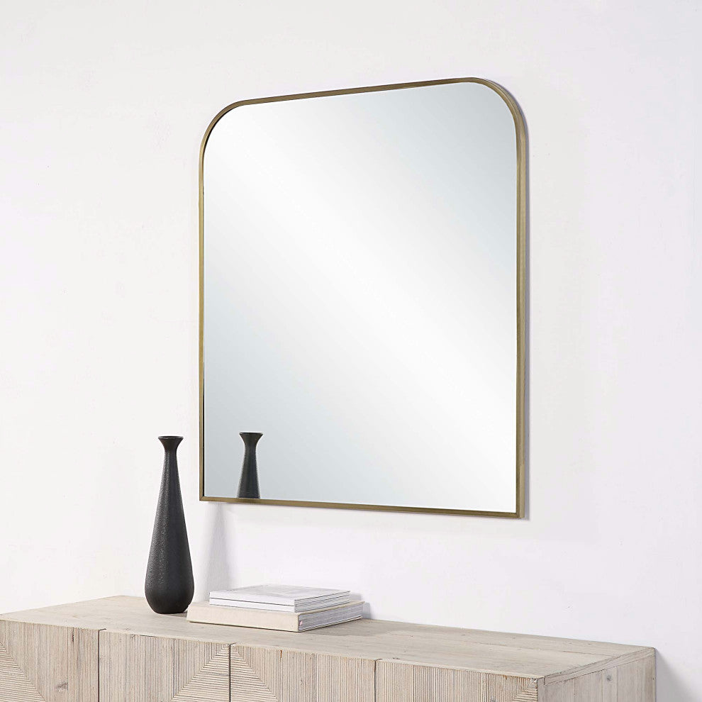 The optimal size to hang or rest above an entryway bench, sofa or dining table, this arch mirror provides homeowners with moments of reflection while brightening the space it''s set within. The sleek antique brushed brass frame gives this mirror an aesthetic that fits within mid-century modern, classic and contemporary interiors. The unique curved angles of this framed mirror are inherently charming, and this charm radiates off to the accessories and fixtures in its midst.