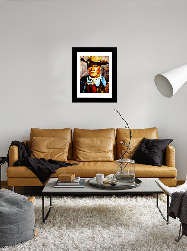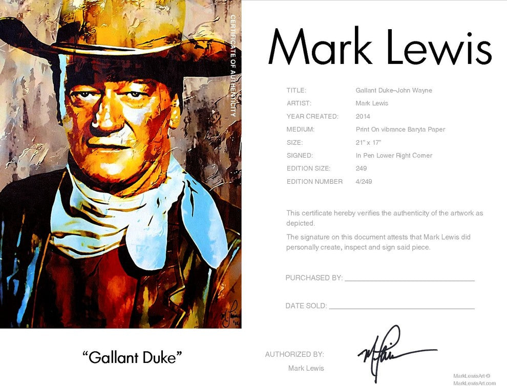 John Wayne "Gallant Duke" by artist Mark Lewis. Lewis is a living relative of Denton Cy Young the legendary baseball player and Baseball Hall Of Fame recipient. This collectible limited edition art is titled "Gallant Duke" The subject is John Wayne. The complete edition Size is 249. Each piece of artwork will be delivered with a "Certificate of Authenticity" Mark Lewis, a renowned artist from southern California, has created his first giclee, print and poster series now available to the public. Born Mark Alan Holmes in Akron, Ohio, raised in Charter Oak, California, Marks'' career path has certainly been an eventful one. After serving honorably in the United States Navy Lewis then delved into the performing arts. He spent years as a successful actor, appearing in numerous movies and television programs. Ultimately turning his focus to painting, Lewis brought his expansive life adventures, raw talent and inspiration to the canvas. Lewis instills an immense beauty and creativity in the work that flows from his palette. He achieves that rare feat among artists of creating an unspoken dialog between artist and viewer in his work. Lewis'' paintings, prints and posters have been exhibited in numerous galleries throughout the U.S.MEDIUM: This art is a fine art print on Vibrance Baryta paper. Hand signed and numbered by the artist Mark Lewis. ( This artwork is not a poster )SPECIFICS: Frame Size - 25" x 21" Art Print Edition Size - Limited Edition of 249 - The number delivered will be randomCERTIFICATION: This art is delivered with a signed and dated Certificate of AuthenticityFRAMING: This art is framed in a black 2 1/2" frame and ready to hang in your home
