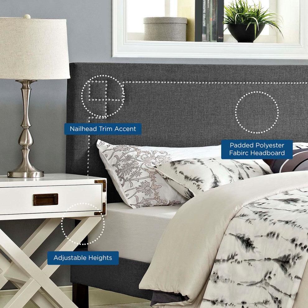 Enhance decor with the elegant Josie Headboard in Fabric. Fashioned with diamond-patterned silver accent nail buttons, Josie features a solid wood frame, adjustable black coated metal legs, and dense foam padding for ultimate support. Finely upholstered in polyester fabric and designed to delight, Josie is a glamorous-Piece that complements traditional, contemporary and modern bedrooms admirably. Fully Compatible with Loryn and Tessie Platform Bed Frames.Set Includes:One - Josie Queen Headboard Overall Product Dimensions: 3"L x 63.5"W x 40 - 47.5"H