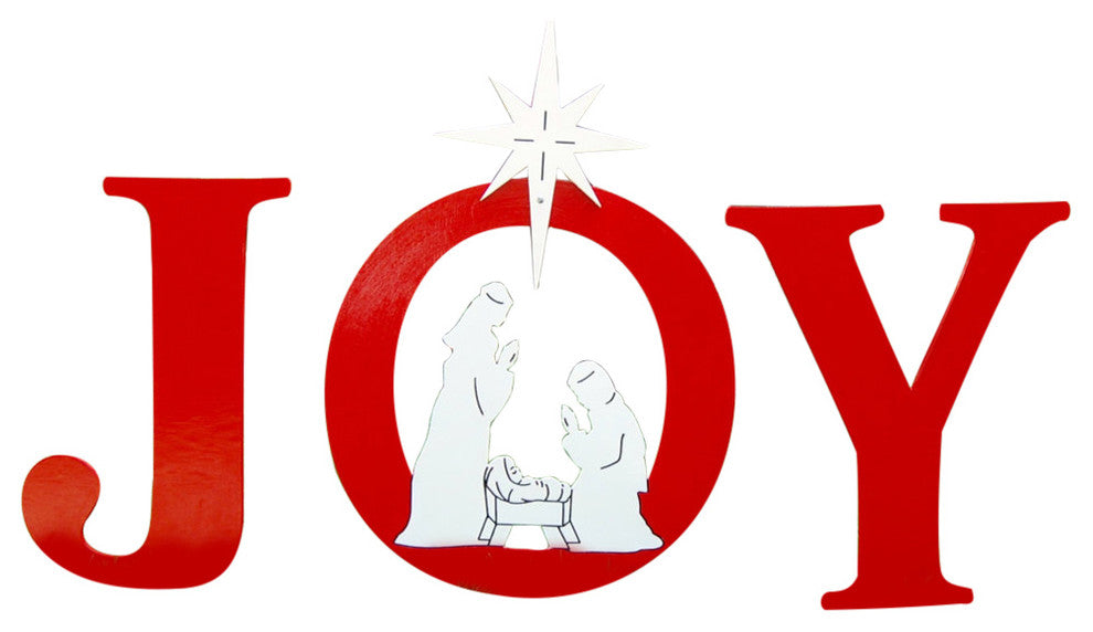 This one of a kind JOY sign has a beautiful depiction of Joseph, Mary and baby Jesus under the northern star. The scene is cut onto the O of Joy with the details engraved and painted black. The letters J, O, Y are painted a vibrant red that contrast nicely with the white nativity.This sign looks great in the daytime as well as the night. Place a spot light on it and it''s sure to be noticed.My yard art is made from the best materials I can find. I use a resign coated wood that won''t splinter and I paint my signs with three coats of exterior paint and seal all sides with a weather protectant sealer. The signs include durable steel stakes that make set up a breeze.Measurements:- J is 24" tall by 17" wide- O is 33" tall to the top of the star by 23" wide- Y is 24" tall by 20" wide - Star is 16" tall by 12" wideDetails:- cut out of high quality resin coated wood made for outdoor sign use - hand painted with high gloss exterior paint- sealed with an all weather sealer - includes attached steel stakes for lawn display - the back of the sign is painted black and weather resistant sealed