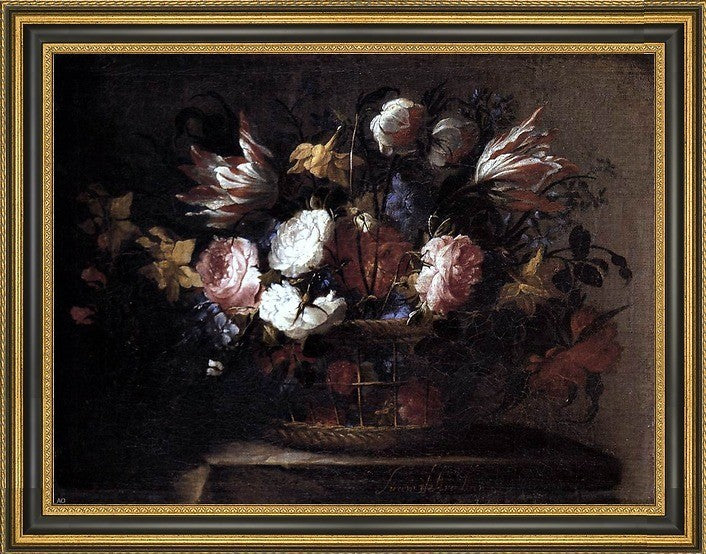 18" x 24" Juan De Arellano Still-Life with a Basket of Flowers framed premium canvas print reproduced to meet museum quality standards. Our Museum quality canvas prints are produced using high-precision print technology for a more accurate reproduction printed on high quality canvas with fade-resistant, archival inks. Our progressive business model allows us to offer works of art to you at the best wholesale pricing, significantly less than art gallery prices, affordable to all. This artwork is hand stretched onto wooden stretcher bars, then mounted into our 3 3/4" wide gold finish frame with black panel by one of our expert framers. Our framed canvas print comes with hardware, ready to hang on your wall. We present a comprehensive collection of exceptional canvas art reproductions by Juan De Arellano.