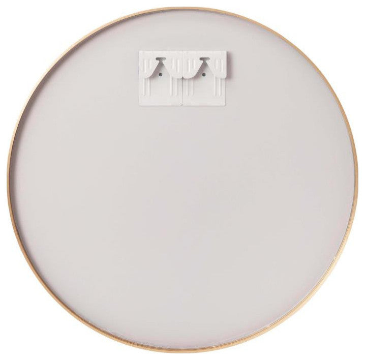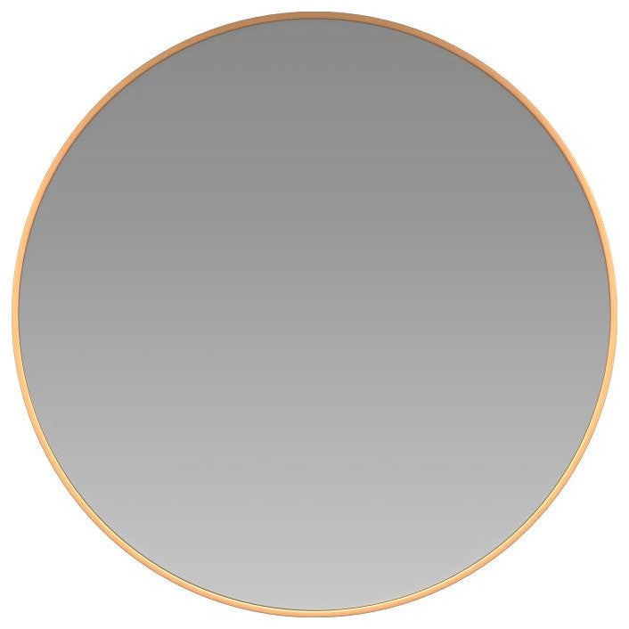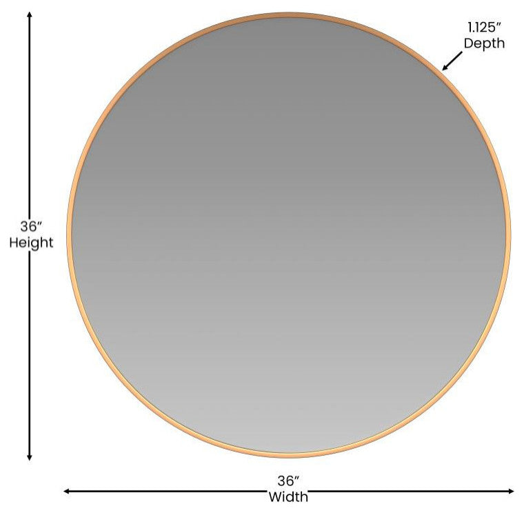 • Whether you''re updating your space or moving to a new one, gather natural light and make any room in your home seem bigger with this round wall mount mirror. The modern design boasts a slim, oxidized gold aluminum frame that lends an aged look to blend in almost any decor. Silver backed 4mm glass provides high reflectivity for a distortion-free image. Modern mirrors are safety-minded for a better fit in homes with children and pets. Shatterproof backing technology ensures the glass stays put in case of accidental breakage to prevent cuts to small feet or paws. The waterproof and rust-resistant design make this large mirror ideal for use in high humidity areas such as bathrooms, kitchens, and balconies. The mounting hardware is included with your new mirror so you can install it as soon as you receive it. Clean with water followed by a dry cloth to maintain its great looks. • 36 Inch Round Wall Mount Accent Mirror• Slim Gold Aluminum Frame for a minimalist look; Frame Thickness .3125"• 4mm Thick Silver Backed Glass is highly reflective• Waterproof and Rust Resistant ideal for high humidity areas• Shatterproof Safety Backing prevents flying glass if broken• Mounting Hardware Included for quick installation• Hanging mirror can be used as decor or as a vanity or bathroom mirror• Single Unit Weight: 22.5 lbs• Item Width: 36 Inches• Item Depth: 1.125 Inches• Item Height: 36 Inches