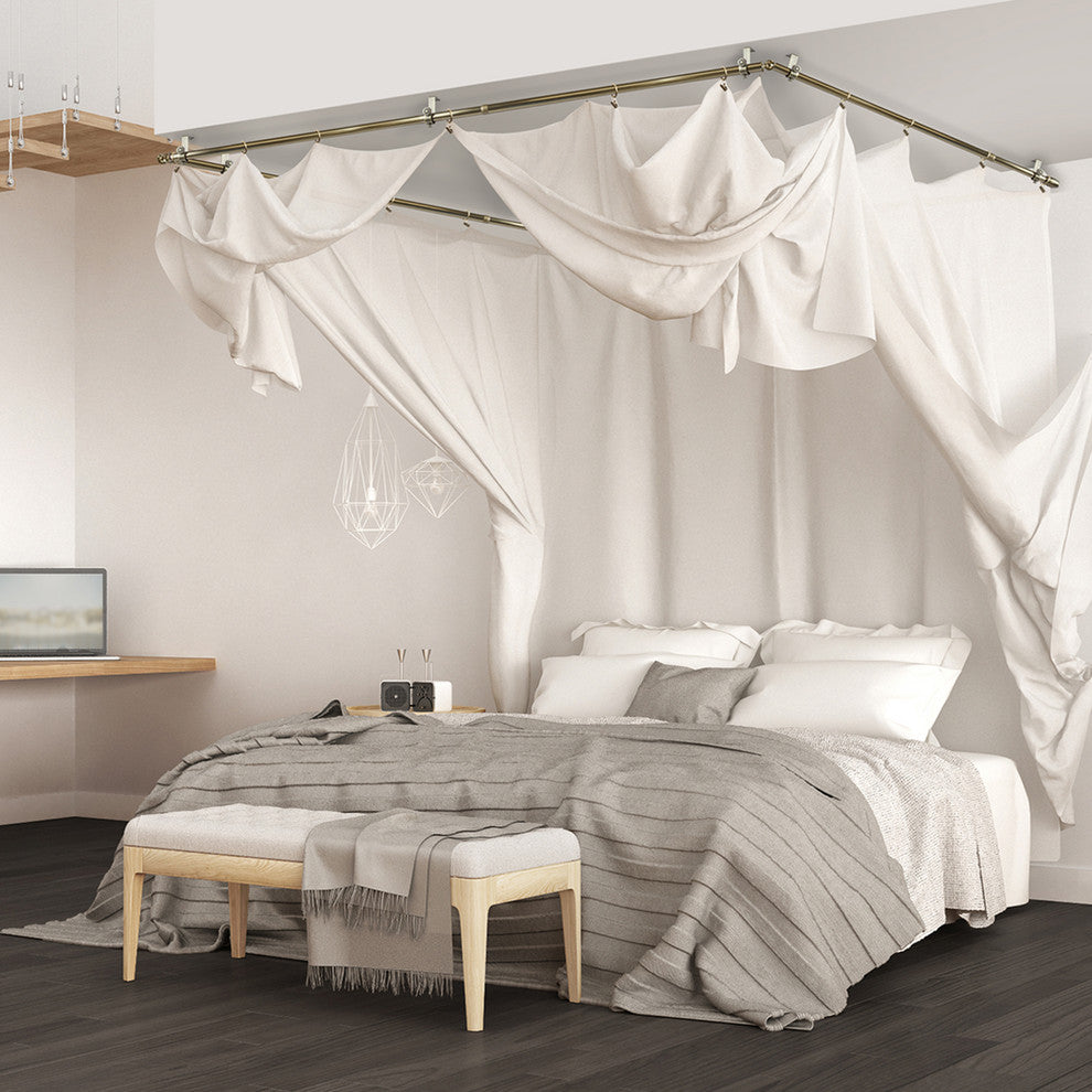 Divide spaces with ease, this multi angle room divider rod can effortlessly decorate and separate a space. Perfect for shared dedrooms, studios, dorms, workspaces, and living room. The corner connector allows for nearly 360 degree rotation to fit into any angles.Includes three sets of 48-84 inches adjustable telescoping rod, 10 brackets, 2 finials, and 2 corner connector.Rod Diameter: 0.81 inchFinial Measurement: 2" W x1-3/8" H x 1-3/8" DBracket Projection: 2.875 inchesSteel rod and plastic finial