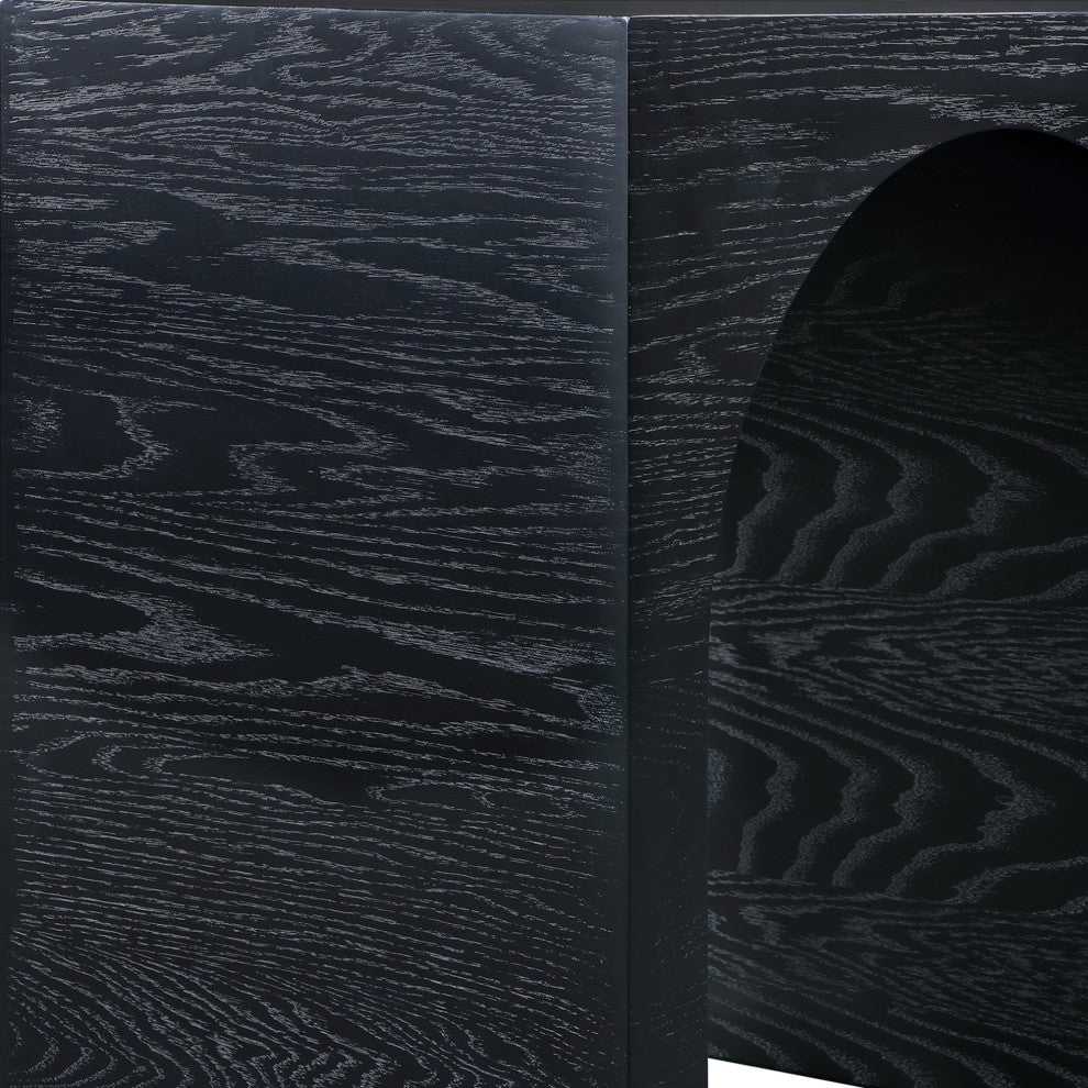 Modernize your home with this black oak console table from our June collection. Its solid oak construction guarantees durability for years to come, while its black finish goes with any existing home decor. Its double arch design is unique and is sure to become a favorite conversation piece. A flat surface provides space for decorative items such as vases, candles, and knick-knacks, or storage space for books, mail, and more. Its mid-century design is sure to liven up your home.Overall Product Dimensions: 54" W x 18" D x 30" HSolid White OakBlack FinishMaximum Arch Width: 23"Maximum Arch Height: 27.25"Mid Century DesignNatural Wood Grain Variation - No Item has the same grain finish or wood knots due to natural factors.