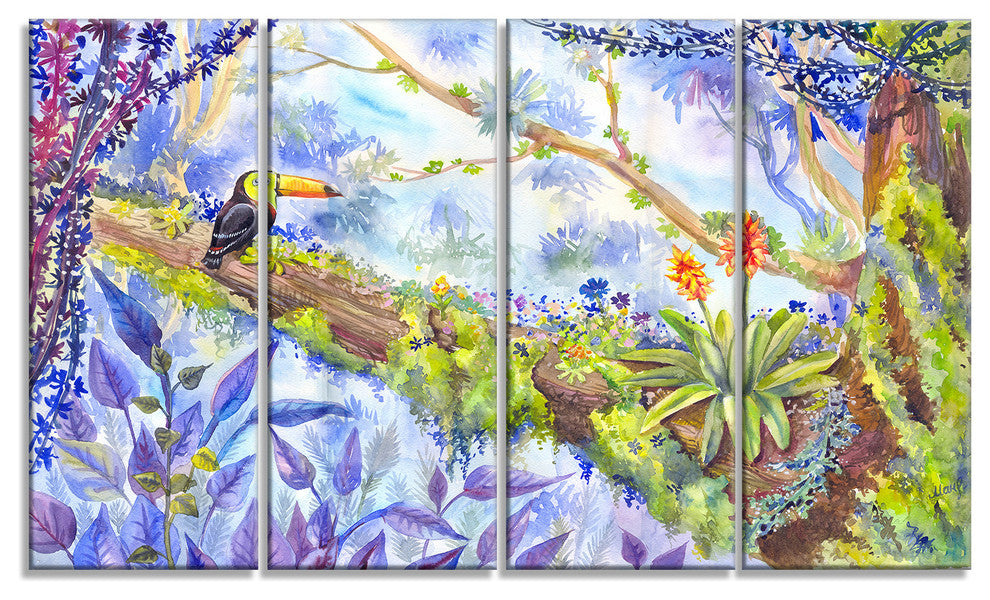 "Jungle With Bird Toucan On Tree" Wall Art Landscape, 4 Panels, 48"x28"