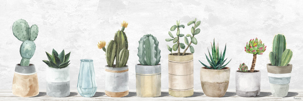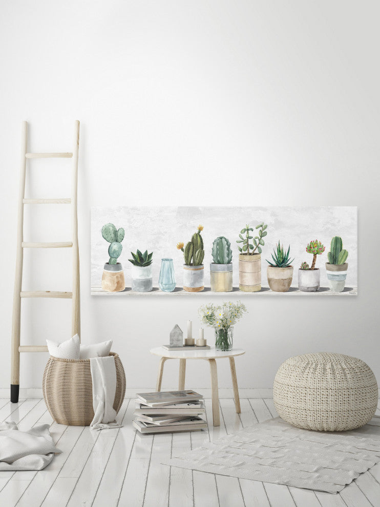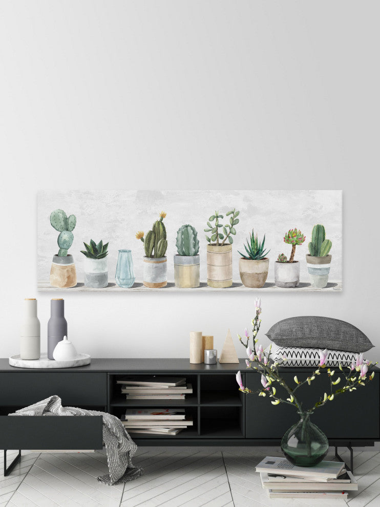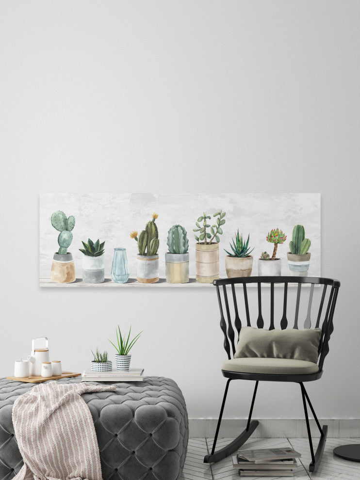 This watercolor painting print showcases a cute collection of green succulents rendered in various patterned pots! Proudly made in the USA, this piece is printed on canvas before it''s stretched over non-warping wooden bars for a gallery-wrapped look. With wall-mounting hooks included, this artful accent is ready to hang up as soon as it reaches your front door.