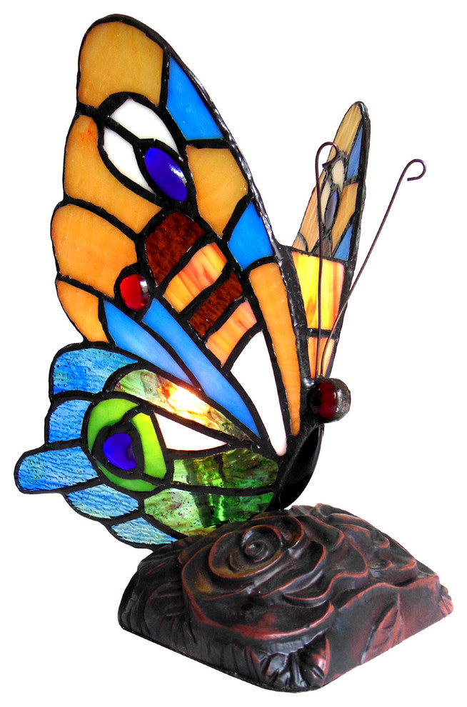 This Tiffany style butterfly design accent lamp contains hand cut pieces of stained glass with bronze finish base and will compliment many decors throughout your home.