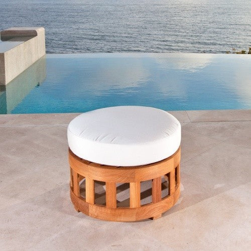 Please refer to secondary images to view selected color | The simple circular shape of the Kafelonia Ottoman defines the beauty of casual luxury in teak. All round slats of 5/8 solid teak supports the Velcro attachable, deep seat cushion. Marrying traditional craftsmanship and contemporary design, the ottoman complements both traditional and modern styles, and can easily adapt to any indoor setting. Quick Dry Foam with Dacron Wrap with covers made of Premium Sunbrella Fabric. 5 Year warranty against fading. All of our Sunbrella cushion fabrics are easily removable and machine washable.