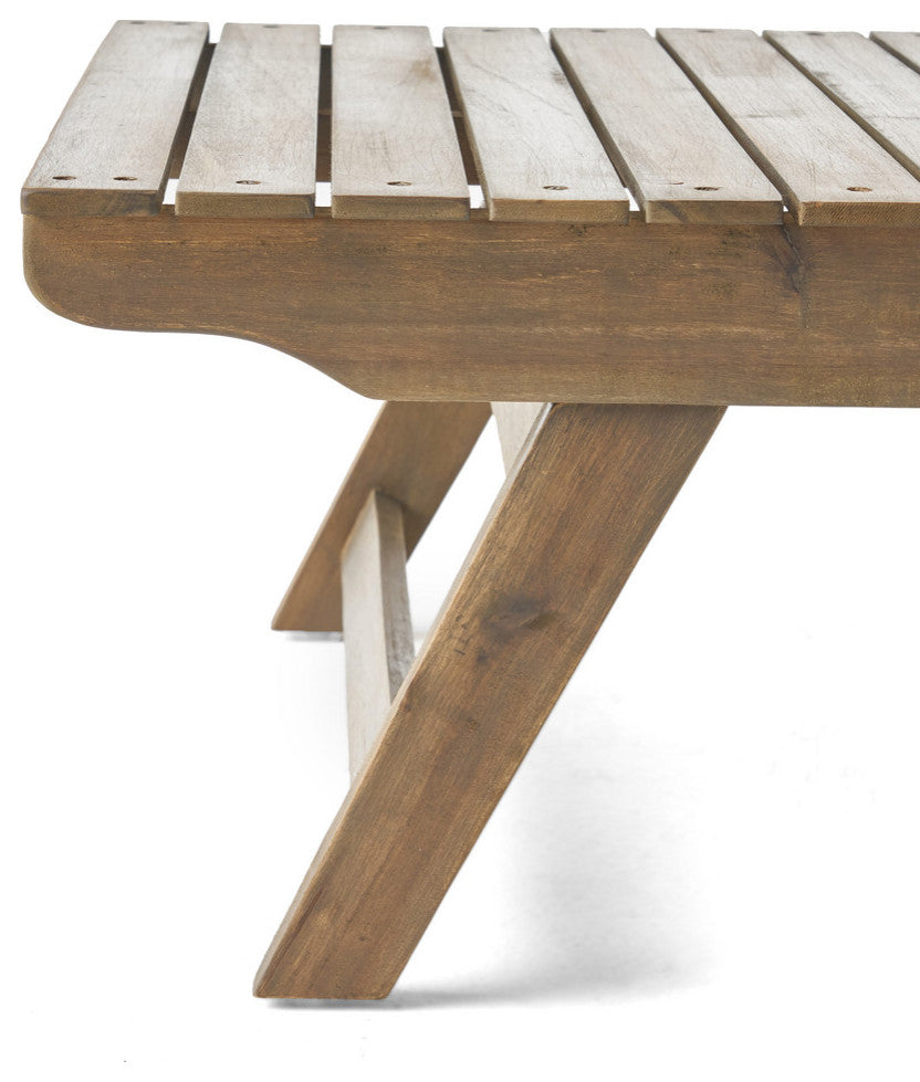 Anchor your outdoor furniture around a sleek wood centerpiece that brings an organic touch to your decor. With a natural acacia wood construction, our coffee table offers both great durability and classic style to your lounge space. Crafted with clean lines and a simple structure, our coffee table offers an open slat design that will upgrade your backyard or patio space with a touch of class. Seamlessly blending into any arrangement, this table is the perfect addition to any outside decor.• • ACACIA WOOD: Made with acacia wood that brings a sleek and exotic look to your space, this durable hardwood naturally withstands outdoor elements and will not darken over time. Acacia wood is perfect as a solid, heavy frame that resists wear and tear.• • OPEN SLAT DESIGN: The top of this coffee table features a lovely open slat design with vertical panels for a classic outdoor look. This pattern gives your decor an enlivening accent. • • DIMENSIONS: Choose an accessory that is the perfect size for you and your furniture. This coffee table measures to be 37.00" L x 24.00" D x 12.50" H. You will love how much your space can transform with the simple addition of this table.• • EASY TO MAINTAIN: This table is naturally weather-resistant to most elements and its lifespan can be extended by covering or storing when not in use.• • ASSEMBLY REQUIRED: Some assembly is required for this table. All of the instructions and tools needed for assembly are included.• Includes: One (1) Coffee TableMaterial: Acacia WoodFinish: GraySome Assembly RequiredHand Crafted DetailsDimensions: 24.00 inches deep x 37.00 inches wide x 12.50 inches high
