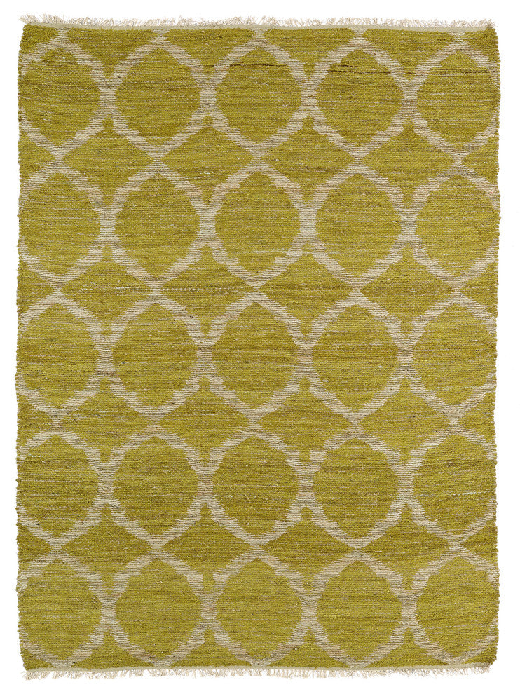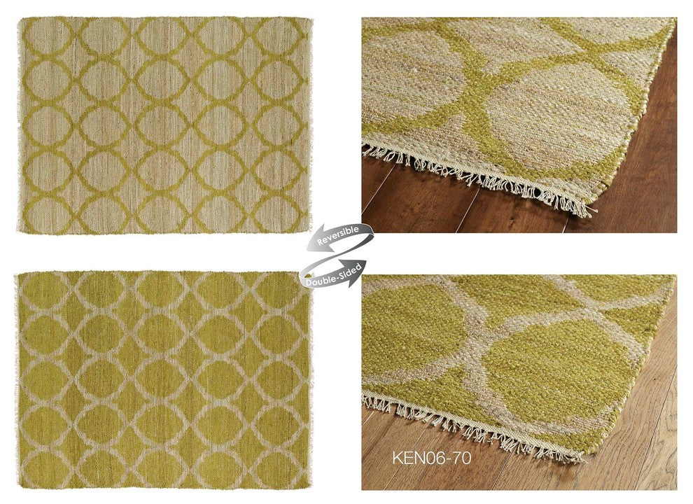 Get two looks in one with the Kaleen Kenwood Reversible Rug. This flat-woven double-sided rug features a chartreuse-and-tan subtle quatrefoil design, bringing a fresh touch to your floors. It is crafted from natural jute and recycled sari silk, woven together by skilled artisans in India. This striking rug adds a fun pattern to traditional or transitional-style decor.Double-sided rugOne side is tan with a chartreuse print and the other is chartreuse with a tan printColor: Tan and yellow-greenMaterials: Jute and viscose sari silkDimensions: W 7''6" x D 9''
