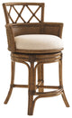 This swivel counter stool features incredible detailing through its leather wrapped rattan base with split rattan wrapped frame. This highlights its intricate herringbone pattern of woven rattan on the outside arms and back. It is available as shown in its standard fabric: Sailcloth - a tight linen weave construction in an ivory and gold coloration.