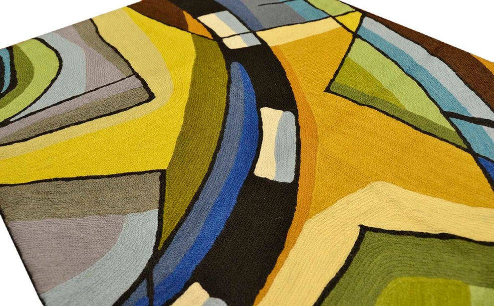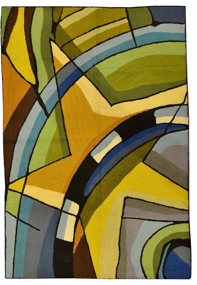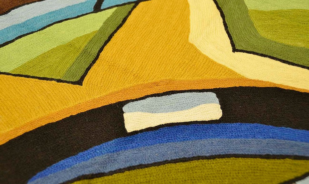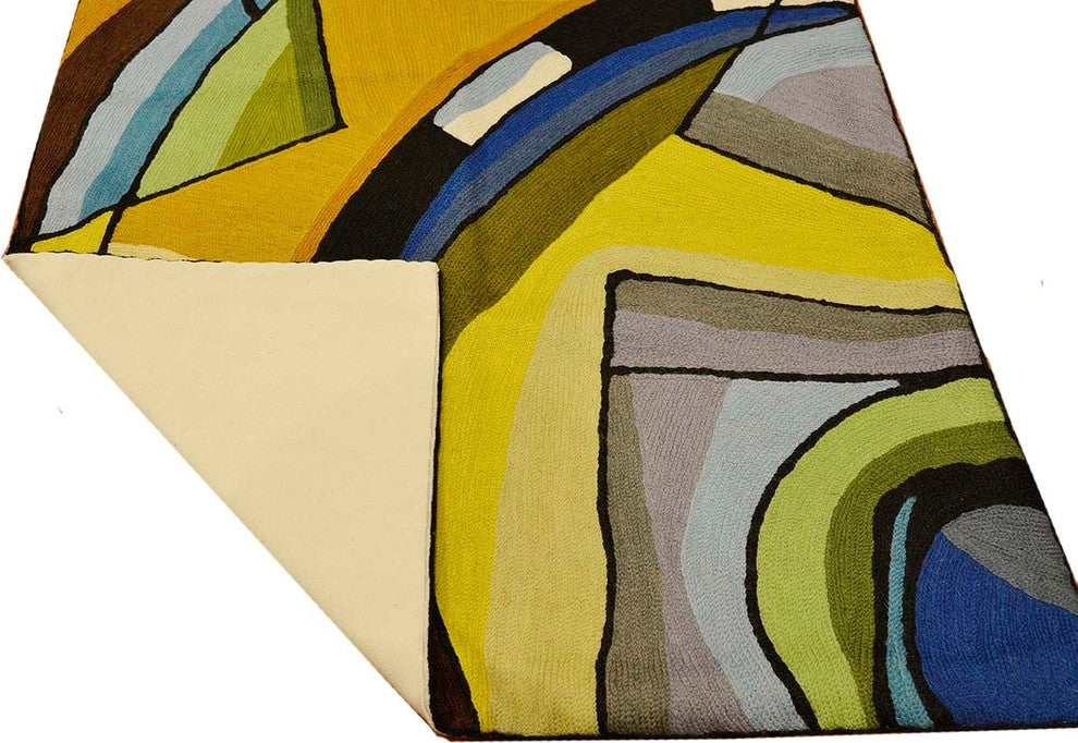This modern accent wool Rug is hand embroidered by the finest artisans of Kashmir and design inspired by the works of modern artist, Wassily Kandinsky. Many of our customers buy these contemporary rugs as a wall art to decorate the walls of their modern homes or to spice up their traditional decor. The expert Kashmiri needlework in this handmade, hand embroidered contemporary rug is of the finest chainstitch, a superlative stitch. The eye-catching design deserves to be seen and experienced. Wherever you place it, it is sure to draw attention. The Kashmir wool makes it soft to the touch, and the texture of the embroidery is a sensory delight. This area rug will make an excellent outdoor or indoor rug and will add fun and festive atmosphere to your home. A close-up view of this abstract modern rug allows you to see the amazing chain-stitch embroidery work of master artisans who have practiced this art their entire lives.This abstract rug could grace the cabin of your boat or the wall in your office. Perfect wherever you need a splash of color, this modern area rug creation is as durable as it is beautiful.The creases visible in the pictures are due to fold and will straigten instantly once mild iron is used from the back.Size: 2ft x 3ft ( 61cms x 91cms)Hand-embroidery: 100% Hand dyed Soft WoolBack & Base: 100 % Cotton CanvassWashing Instructions: Cold Hand Wash, Dry Flat & Mild warm Iron or simply Dry Clean.Cottage Industry ProductKandinsky conveyed profound spirituality and inner human emotion through a visual language of abstract forms and colors that transcended cultural and physical boundaries. He used interrelation between color and form to create an aesthetic experience that engaged the sight, sound, and emotions of the viewer.Kandinsky viewed music as the most transcendent form of non-objective art "“ musicians could evoke images in listeners"™ minds merely with sounds. He crafted spiritually rich paintings that alluded to sounds and emotions through sensations. Modern Artist Wassily Kandinsky used the form of concentric circles to portray the soul. Rendered here as chain stitch embroidery work, this cushion cover can create a new personality for any room in which you choose to use it.