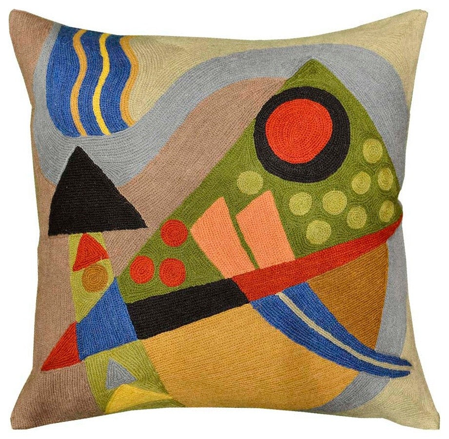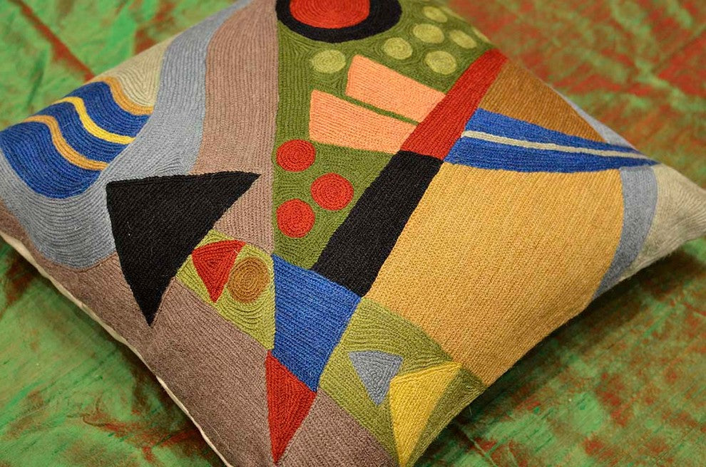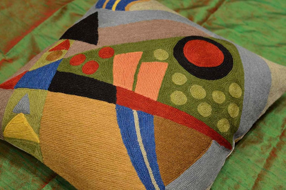 Kandinsky Pillow Cover- The colors in this abstract composition, reminiscent of the work of influential Russian artist, Wassily Kandinsky, evoke a psychic vibration, hiding a power still unknown but deeply felt in every part of the body. The entire cotton base of the pillow is overlaid with hand embroidery, stitch by stitch, creating an extraordinary showpiece for your decor.Uniquely handcrafted this accent modern artful pillow cover will make an exceptional addition to your beautiful home or office or refresh your patio with the inclusion of this contemporary pillow. Composition: 70% Wool, 30% CottonSize: 18" x 18" (45cms x 45cms)Pillow Insert not Included (Only Cover is on Sale)Hand embroidered in Village Cottage UnitsBacking: Canvas (See the Last Picture)View additional pictures to see the intricate embroidery done in highly stylized beautiful patterns and superb craftsmanship unparalleled in the whole world.A close-up view of this abstract pillow cover allows you to see the amazing chain-stitch embroidery work of master artisans who have practiced this art their entire lives. This abstract decorative pillow cover could grace the cabin of your boat or the chair in your solarium and yet be equally as comfortable in your den. The eye-popping color and pattern of this modern throw pillow are just what the designer ordered to create a fiery focal point in your décor. Perfect wherever you need a splash of color, this art work pillow creation is as durable as it is beautiful. Easy to care for, this cushion cover could spark up an old throw pillow or grace a new pillow form. Kandinsky conveyed profound spirituality and inner human emotion through a visual language of abstract forms and colors that transcended cultural and physical boundaries. He used interrelation between color and form to create an aesthetic experience that engaged the sight, sound, and emotions of the viewer. Kandinsky viewed music as the most transcendent form of non-objective art "“ musicians could evoke images in listeners"™ minds merely with sounds. He crafted spiritually rich paintings that alluded to sounds and emotions through sensations. Modern Artist Wassily Kandinsky used the form of concentric circles to portray the soul. Rendered here as chain stitch embroidery in art silk, this cushion cover can create a new personality for any room in which you choose to use it.