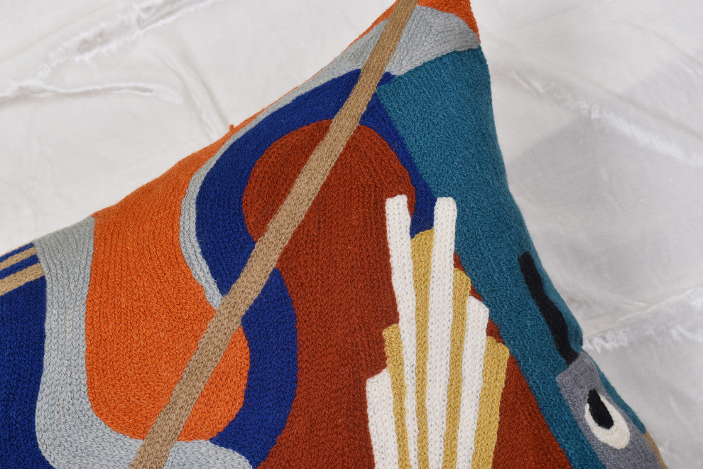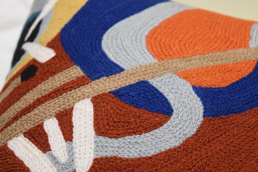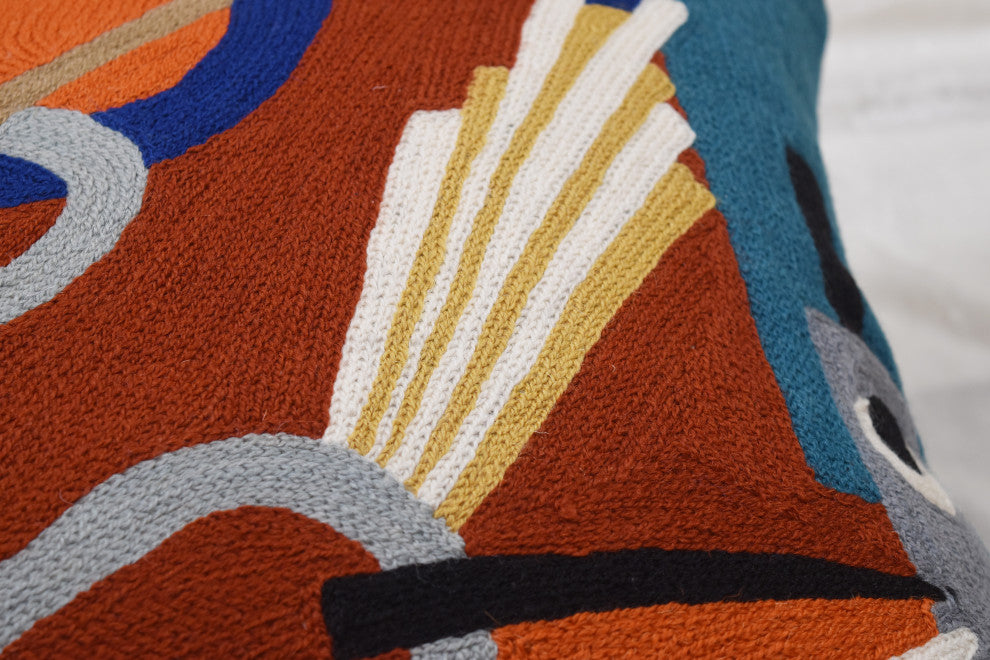 Kandinsky pillow cover intuitive flow "“ Star fragments and enigmatic hieroglyphs artfully stitched in the finest Kashmir wool chainstitch needlework. Cosmic colors like blue, lavender and silver complement earthier tones of terra cotta, harvest green and amber to recreate a design based on the work of influential Russian artist, Wassily Kandinsky.The exciting pattern evokes the thought of a ladder to the stars, a comet"™s tail,or a star map. This cover could grace the cabin of your boat or the chair in your solarium and yet be equally as comfortable in your den. Durable and easy to clean, this toss pillow will catch the eye of every passerby.Composition: 70% Soft Wool, 30% CottonSize: 18'' x 18'' (45 cms x 45 cms)Pillow Insert not IncludedA close-up view of this abstract pillow cover allows you to see the amazing chain-stitch embroidery work of master artisans who have practiced this art their entire lives.This abstract decorative pillow cover could grace the cabin of your boat or the chair in your solarium and yet be equally as comfortable in your den.The eye-popping color and pattern of this modern throw pillow is just what the designer ordered to create a fiery focal point in your décor. Perfect wherever you need a splash of color, this art work pillow creation is as durable as it is beautiful. Easy to care for, this cushion cover could spark up an old throw pillow or grace a new pillow form.Kandinsky conveyed profound spirituality and inner human emotion through a visual language of abstract forms and colors that transcended cultural and physical boundaries. He used interrelation between color and form to create an aesthetic experience that engaged the sight, sound, and emotions of the viewer.Kandinsky viewed music as the most transcendent form of non-objective art "“ musicians could evoke images in listeners"™ minds merely with sounds. He crafted spiritually rich paintings that alluded to sounds and emotions through sensations. Modern Artist Wassily Kandinsky used the form of concentric circles to portray the soul. Rendered here as chain stitch embroidery in art silk, this cushion cover can create a new personality for any room in which you choose to use it.Washing Instructions: Cold Hand Wash, Dry Flat & Mild Warm Iron or Simply Dry Clean