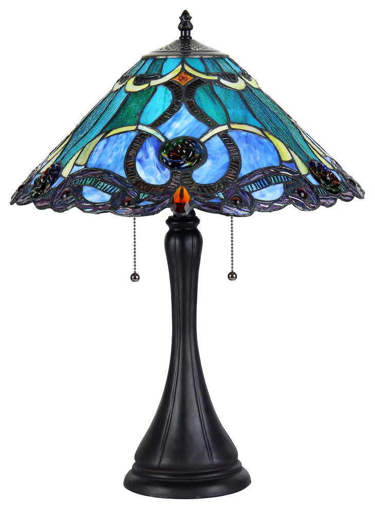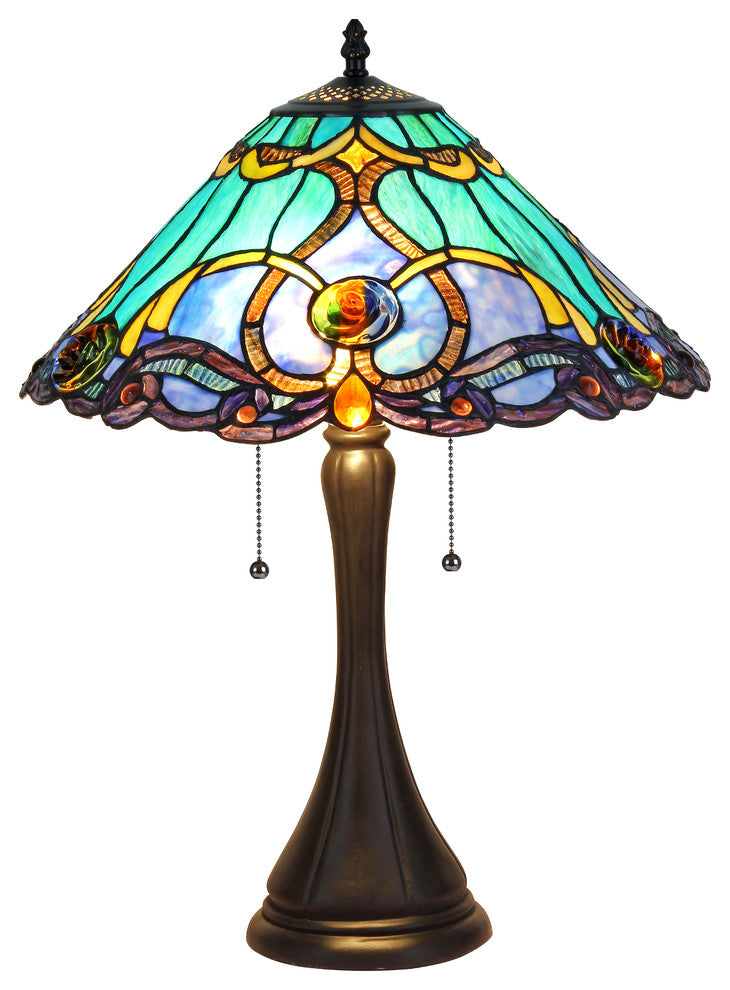 KEEGAN, an exquisitely styled Victorian table lamp designed to reflect warmth to any room.?Handcrafted with top quality materials the shade is made with intricately cut pieces of real stained glass and designed to enhance any decor.?Finished in an antique bronze patina tone, the base design reflects the Victorian era.
