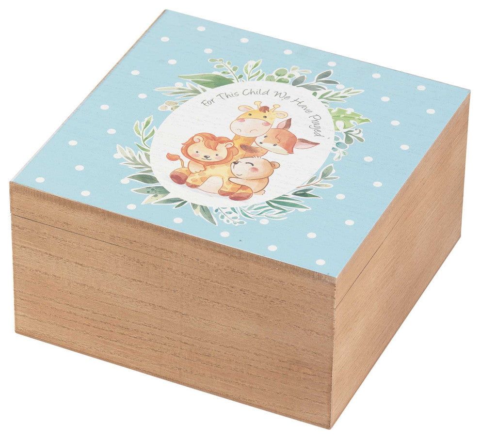 Fill this box with those sweet baby keepsakes to treasure always. Top of lid displays whimsical animal design and the caption "For This Child We Have Prayed." Outside of box has a rustic wood appearance and matte feel. Hinged lid opens to show a holder underneath for your own 6"x4" photo. Inner compartment is 8 7/8"x8 7/8"x4", allowing box to hold a variety of small items. Overall outer box size, with lid closed, is 9 3/8"x9 3/8"x5". Box is MDF wood.