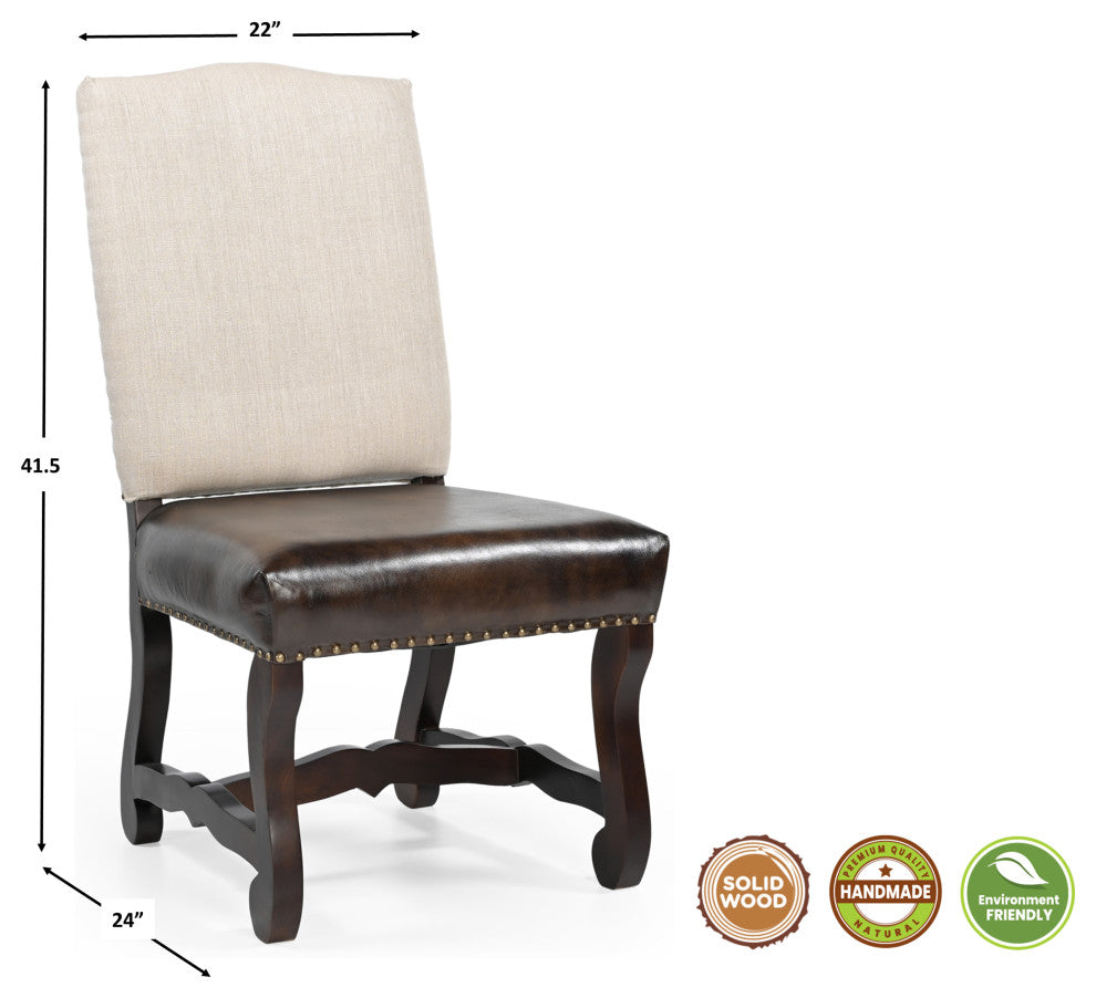 Bring a blend of style and sturdiness to your dining room with this set of two dining chairs. Crafted from solid mango wood, the chairs showcase a robust frame and elegantly curved wooden legs. The seats are upholstered, offering luxurious comfort and a sophisticated look. Nailhead trim adds an extra layer of charm and detail, making these chairs a standout piece. Whether for daily use or special occasions, they bring both practicality and style to your space.