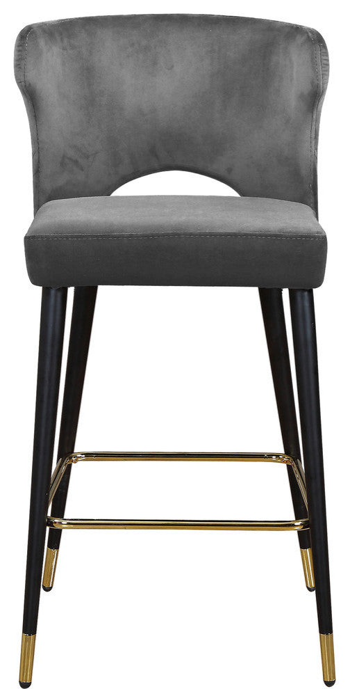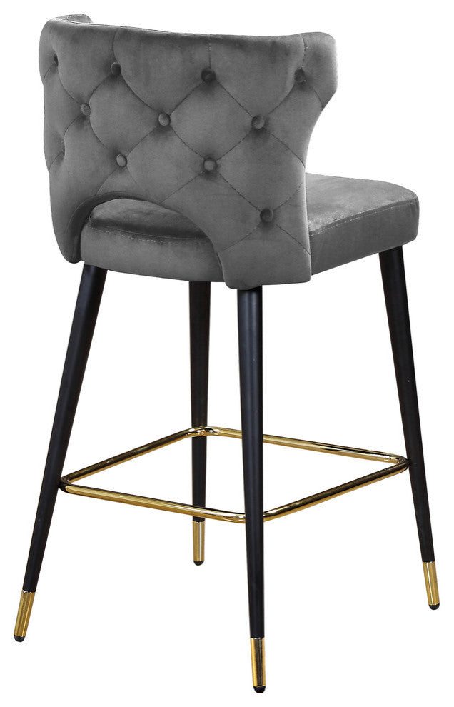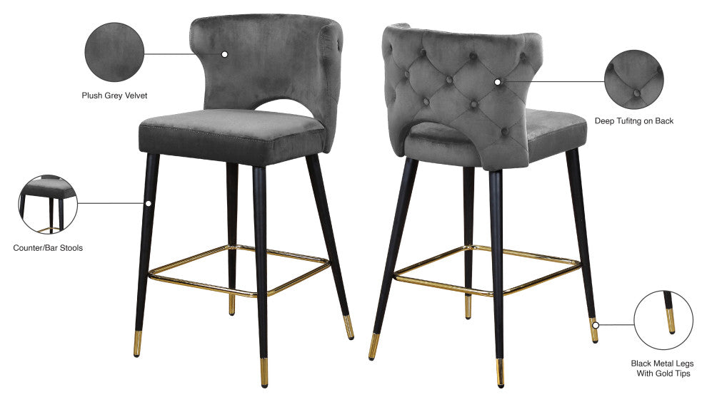 Sit comfortably on this Kelly Grey Velvet Stool. The back and seat cushions are plumply stuffed for enhanced comfort and covered in rich velvet upholstery to give your room a burst of color and jewel-toned fun. This stool has black metal legs with gold tips for added contemporary panache, and it''s built strong and tough, so it stands up to heavy daily use without breaking a sweat. These stools can outfit any bar or kitchen counter area.Overall Product Dimensions: 22" W x 19" D x 38.5" HGrey VelvetDeep Tufitng on BackBlack Metal Legs With Gold TipsCounter/Bar StoolsSeat Dimensions: Seat Width: 17"Seat Height: 27.6"Seat Depth: 16.5"Back Height: 10.5"