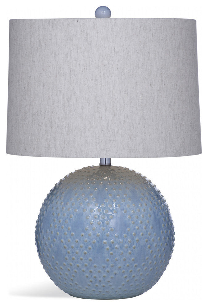 The Kettler Table Lamp boasts a round and textured base, adding depth and visual interest to any space. Its light blue finish offers a timeless yet modern touch, making it a versatile addition to your living area. Crafted with ceramic and topped with a tapered drum linen shade in gray, this lamp casts a soft, ambient glow, perfect for creating a cozy atmosphere in your home.