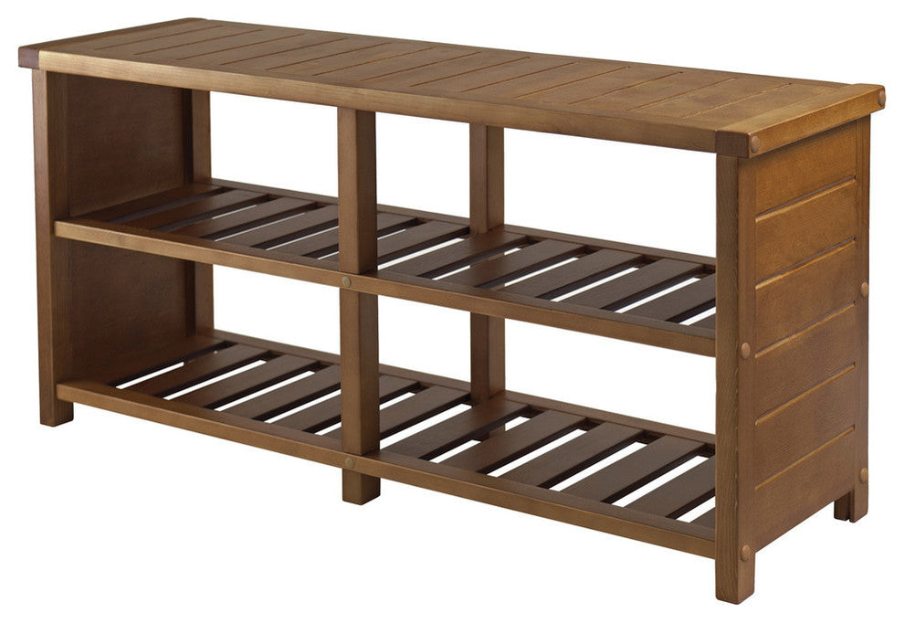 Organize your shoes in your closet, bedroom or entryway with the Keystone Shoe Bench. For closets, use the top seat as an extra shelf to stack clothes or extra shoes. Top dimension 38.4"W x 11.8"D. Bottom two slated shelves have four sections with each dimension about 17.1"W x 11"D x 7.2"H. Made of combination of solid and composite wood in teak finish. Weight capacity is 200 lbs. Assembly required.