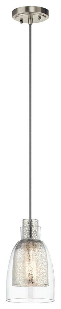 One Light Mini Pendant from Evie collection in Brushed Nickel finish. Number of Bulbs 1. Max Wattage 100.00. No bulbs included. This 1 light mini pendant from the Evie Collection features a unique double layered globe of mercury glass within a clear glass outer shade that creates a unique depth of interest. A simple yet stylish shape adds to the eclectic beauty. No UL Availability at this time.