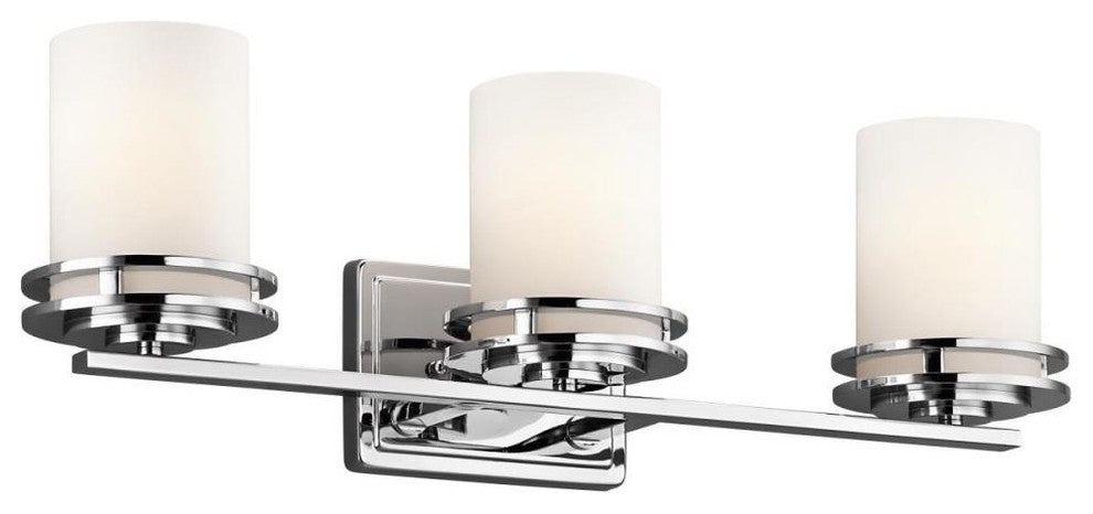 Three Light Bath from Hendrik collection in Chrome finish. Number of Bulbs 3. Max Wattage 100.00. No bulbs included. Named after renowned Dutch architect, Hendrik Berlage, this 3 light wall fixture from the Hendrik(TM) collection is a gorgeous fixture that honors the man who was regarded by many as the in.Father of Modern architecturein. Classic lines are enhanced with a polished, Chrome finish and Satin Etched Cased Opal Glass, in order for this piece to work in a number of different aesthetic environments. No UL Availability at this time.