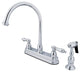 Two Handle Deck Mount, 4 hole Sink application, 8" Centerset, Solid Brass Side Spray, Fabricated from solid brass material for durability and reliability, Premium color finish resist tarnishing and corrosion, 360 degree turn swivel spout, 1/4 turn On/Off water control mechanism, 1/2" - 14 NPS male threaded inlets, Duraseal washerless valve, 1.8 GPM / 6.8 LPM Max at 60 PSI, Integrated removable aerator, 8-1/2" spout reach from faucet body, 12-1/4" overall height, Ten Year Limited Warranty to the original consumer to be free from defects in material and finish.Brass Sprayer IncludedQuarter Turn Washerless CartridgeMetal Lever Handle12" High Gooseneck Swivel Spout8" Center with 8-1/2" spout reachMax 1.8 GPM/6.8 LPM Water Flow Rate At 60 PSI (ASME standard)Compliant with California Energy Commission Title 20