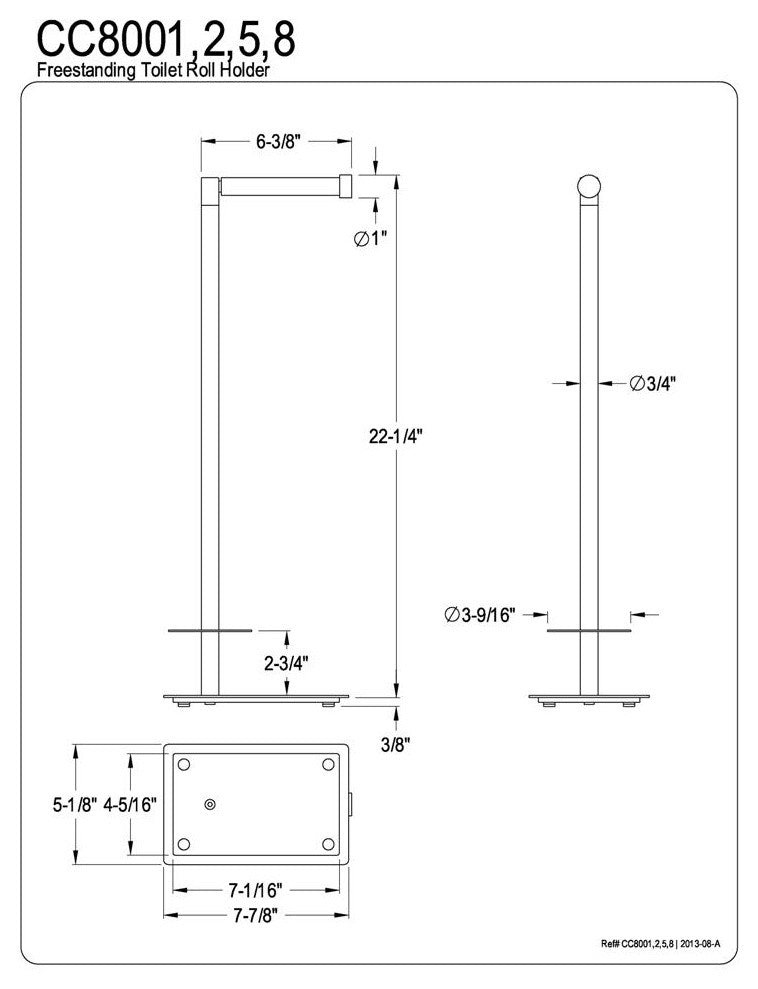 The Kingston Brass Claremont Freestanding Toilet Paper Stand gives the bathroom a contemporary touch. With solid brass and stainless steel construction, durability and reliability are never an issue. The base is weighted to prevent any accidental tip-overs. Installation only requires a few minutes.Manufacturer: Kingston BrassModel: CC8001UPC: 663370315862Product Name: Kingston Brass CC8001 Claremont Freestanding Toilet Paper Stand, Polished ChromeCollection / Series: ClaremontFinish: ChromeTheme: ContemporaryMaterial: Brass & Stainless SteelType: Bathroom AccessoryFeatures: Solid Brass and Stainless Steel ConstructionContemporary DesignHold a single roll of paper22.8" TallWeighted BaseEasy Installation