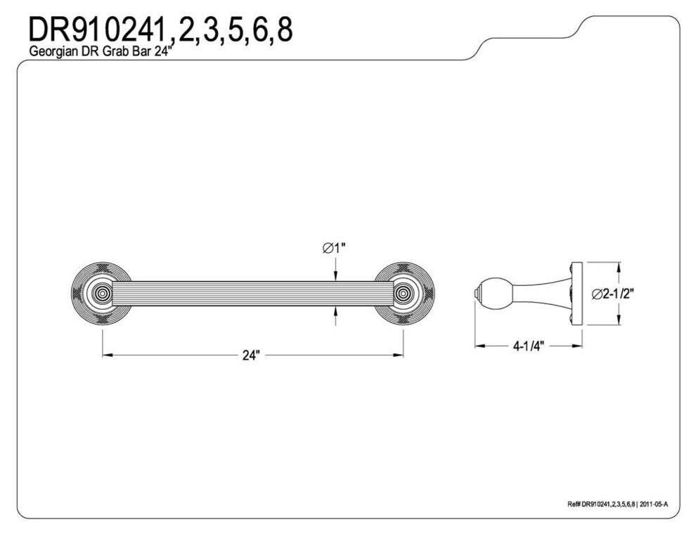 Fabricated from solid brass material for durability and reliability, 10" gripping surface on grab bar, Easy to install, 1" (25.5mm) wall clearance, Mounting hardware included (2"x#10 Philips Head Screw. Total 6pcs), 24" overall length, 1" outer diameter, One Year Limited Warranty to the original consumer to be free from defects in material and finish.Manufacturer: Kingston BrassModel: DR910246UPC: 663370048913Product Name: 24" Decorative Grab BarCollection / Series: GeorgianFinish: Polished NickelTheme: ClassicMaterial: Aluminum+BrassType: AccessoriesFeatures: Brass/aluminum construction for durabilityEasy installationResidential useMatching accessories availableAll mounting hardware included