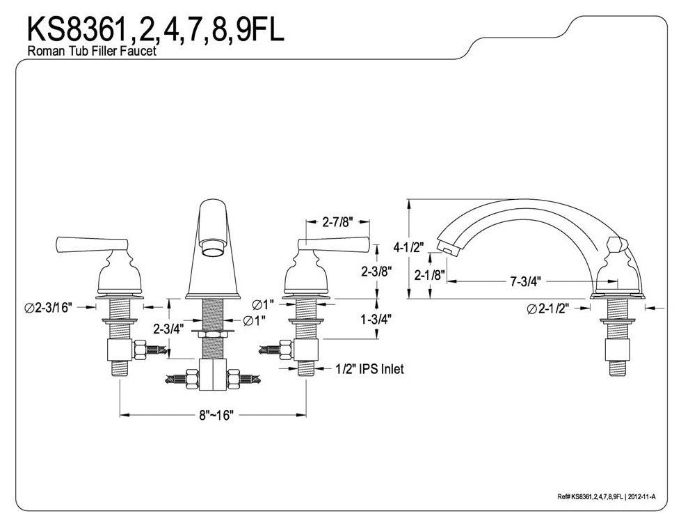 Two Handle Deck Mount, 3 Hole Sink Application, 8" - 16" widespread, Fabricated from solid brass material for durability and reliability, Premium color finish resists tarnishing and corrosion, 1/4 turn On/Off water control mechanism, 1/2" - 14 NPS male threaded inlets, Ceramic disc valve, 7-3/4" spout reach from faucet body, 4-1/2" overall height, Ten Year Limited Warranty to the original consumer to be free from defects in material and finish.Manufacturer: Kingston BrassModel: KS8364FLUPC: 663370028601Product Name: Kingston Brass Royale Two Handle Roman Tub FillerCollection / Series: RoyaleFinish: Polished Chrome/Polished BrassTheme: Contemporary / ModernMaterial: BrassType: FaucetFeatures: Drip-free ceramic cartridge. 3-hole installation. 8" to 16" spread. 1/2"-14NPS. 8.06 GPM Maximum Flow Rate at 60 PSI