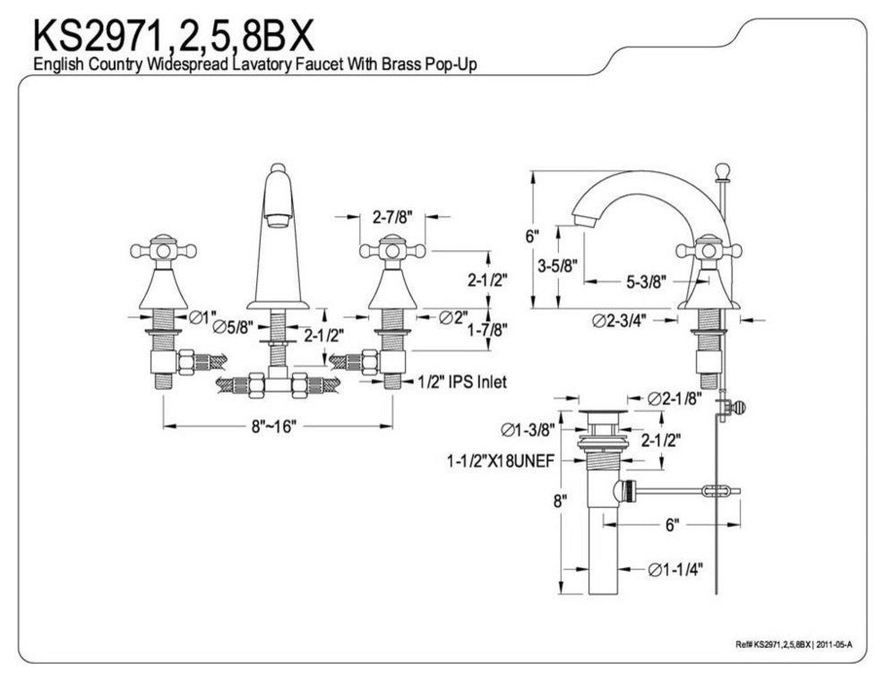 Two Handle Deck Mount, 3 Hole Sink Application, 8" to 16" Widespread, Fabricated from solid brass material for durability and reliability, Premium color finish resists tarnishing and corrosion, 1/4 turn On/Off water control mechanism, 1/2" IPS male threaded shank inlets, Ceramic disc cartridge, 1.2 GPM/4.5 LPM Max at 60 PSI, Integrated removable aerator, 5-1/2" spout reach from faucet body, 6" overall height.Drip-free ceramic cartridge systemDesigned for a lifetime of performanceMeets ASME A112.18.1, ANSI/NSF 61 Sec. 9 codeAll mounting hardware includedMatching accessories availableMax 1.2 GPM/4.5 LPM Water Flow Rate At 60 PSI (ASME standard)Compliant with California Energy Commission Title 20
