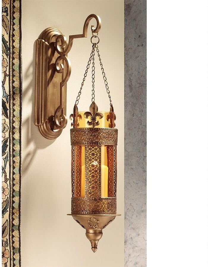 Imagine several of our jewel-toned pendant lanterns lighting your hallway or lending a romantic glow to an intimate space. With richly ornate, bronze-hued, fleur-de-lis filigree ornamentation and amber glass for protecting the flame of your candle, our functional works of decorative wall art are sure to leave your guests impressed! Pillar candle not included. 7"dia.x19"H. 5 lbs.
