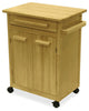 This solid beechwood kitchen cart provides you with a handy food preparation surface and storage cart all in one. Casters provide the cart with high mobility and the pull out drawer, open cabinet behind the door with two removable slatted shelves, and towel holder provide it with ample storage. The overall size of the cart is 26.9"W x 18.2"D x 34.3"H. The top pull out drawer has dimensions of 19.3"W x 13.1"D x 3.8"H. The doors open to an cabinet with a removable shelf. With the shelf in place, the dimension of the lower portion is 20.5"W x 14.4"D x 14.25"H and upper portion of 20.5"W x 14.4"D x 7.5"H. Made of solid beechwood in natural finish. Assembly required.