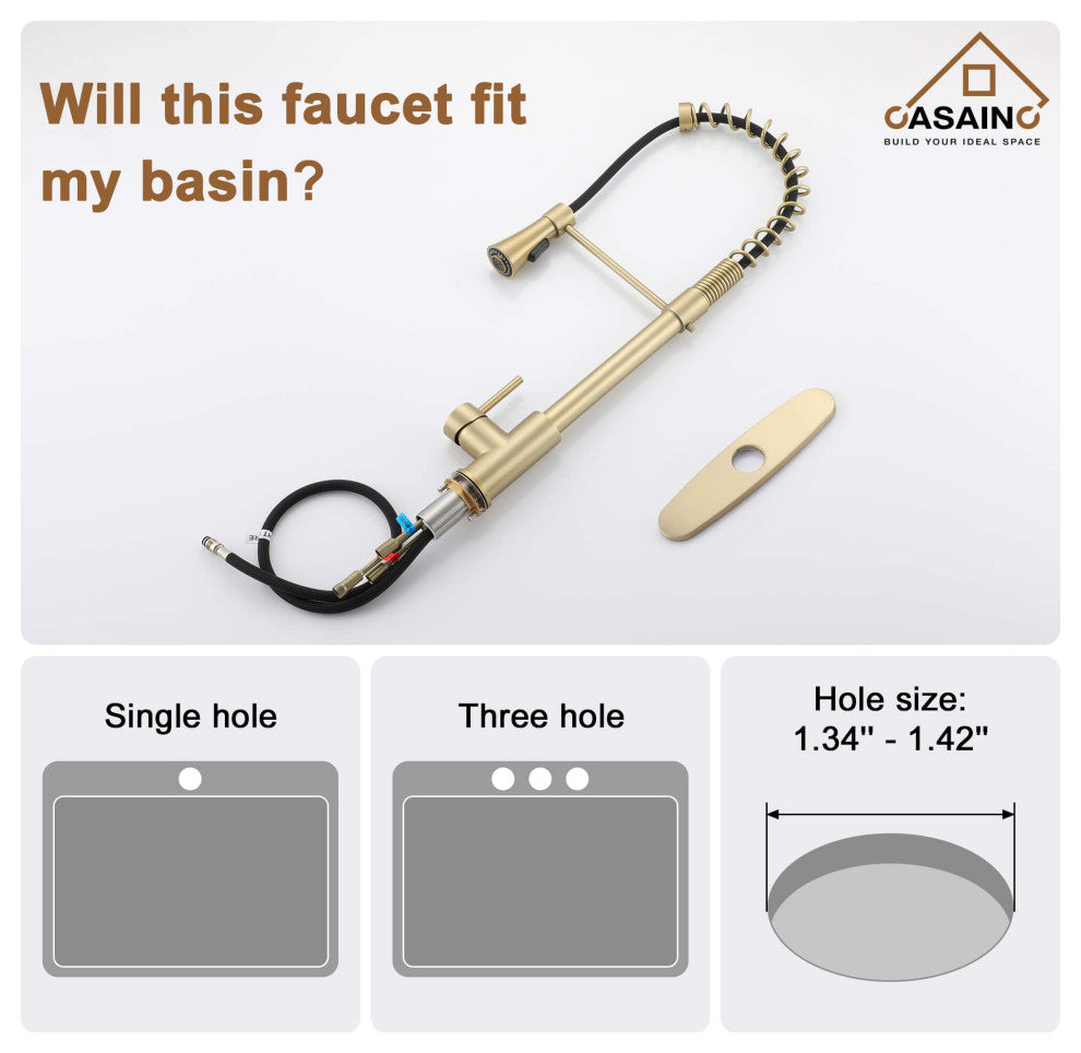 The kitchen faucet from CASAINC updates your kitchen with its sleek style and superior functionality that is essential in every kitchen. Easy to use with a single-handle design, this faucet has a convenient dual-function Spring pull-down spray head that provides maximum flexibility for all your kitchen tasks and allows you to clean every hard-to-reach corner of your kitchen sink. It is easy to install in kitchens with 1 or 3-holes in the sink, making it the perfect choice for any faucet refresh.