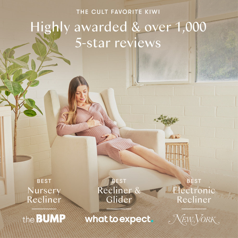 The Kiwi Glider Recliner takes the phrase rest and recharge" to a whole new level with its built-in USB port, smooth swivel motion, and effortless back and forth gliding motion. Lean back and kick up your feet at the touch of a button with this recliner''s quiet electronic control button. It''s a stylish choice with a modern wingback design but also a more sustainable choice for your home. Upholstered by hand in our eco-performance fabric, that is stain resistant, water repellent, and made with at least 30% recycled yarn.FEATURES:-POWER RECLINER: Smooth and quiet reclining mechanism lowers headrest and raises footrest effortlessly with the push-button control panel and an included USB A/C charging port keeps your phone fully charged. PLEASE NOTE: Charging panel is only rated for small devices such as a phone, DO NOT use for large devices such as a tablet. Doing so will damage the motor and eliminate power (charging and reclining) capabilities.-SWIVELS AND GLIDES: Effortlessly swivels 270 degrees and glides back and forth in an upright position.-GREENGUARD GOLD CERTIFIED: Tested for over 10,000 chemical emissions and VOCs, undergoing rigorous scientific testing to meet some of the world''s most stringent chemical emissions requirements. It contributes to cleaner indoor air, creating a healthier environment for your baby to sleep, play, and grow.-ECO-PERFORMANCE FABRIC: We want to help you make more sustainable choices in your home. At least 50 recycled plastic bottles were used in the making of this eco-performance fabric utilizing LiveSmart performance fabric + at least 30% REPREVE recycled polyester yarn.-WATER-REPELLENT and STAIN-RESISTANT: Life with a babe can be messy! Our eco-performance fabric is made for real-life, it''s water-repellent, stain-resistant, and durable.-EMISSIONS-TESTED: Foam used in the seat meets all CA TB117-2013 flammability requirements and is CertiPUR-US certified, certifying the foam is made without PBDE or Tris flame retardants, heavy metals, formaldehyde, CFCs, and phthalates regulated by the CPSC.-FSC CERTIFIED WOOD: Wood used in the frame of this product comes from well-managed, FSC-certified forests. The FSC label means that wood has been harvested to benefit communities, wildlife, and the environment.-EASY SETUP: A few simple steps with no tools required.-COMPLETE THE LOOK: For ultimate comfort and relaxation pair with the Kiwi Gliding Ottoman (sold separately)