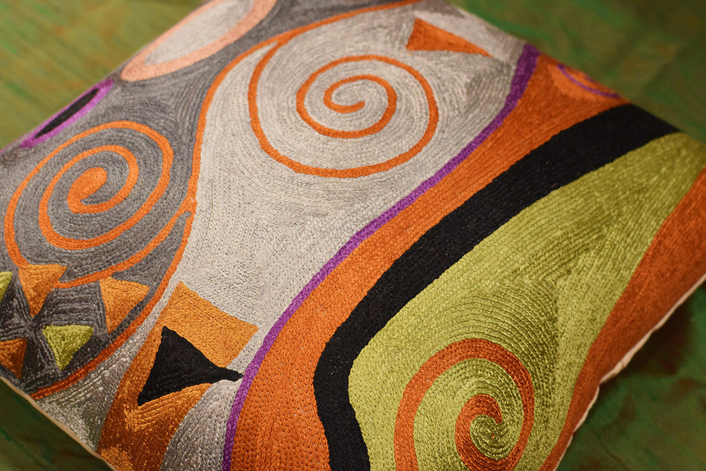 Klimt Cushion Cover Blue Green modern abstract pillow "“ The design depicts Symbolist artist, Gustav Klimt"™s Tree of Life motif with blue and green accents. Klimt loved blues, and here they grace the piece as rare jewels upon gold branches. Examining the close up photos reveals the exquisite chain-stitch embroidery. The Tree of Life branching up to the night sky with and its roots in the earth. Using elements of Klimt, yet quite possibly also inspired by Van Gogh"™s "œThe Starry Night,"� this piece offers a dramatic accent to any room. This is world-class workmanship created to enhance your world with dynamic color and motif.Composition: 70% Art Silk, 30% CottonBacking: Canvas ( See Last Picture )Pillow Insert not Included (Only Cover is on Sale)Hand embroidered in Village Cottage UnitsThese modern pillow covers are handcrafted by Kashmiri artisans, and are of the finest chain-stitch embroidery in the world.Created of soft Kashmir wool over cotton, this all-natural cover makes an enduring impression.A close-up view of this abstract pillow cover allows you to see the amazing chain-stitch embroidery work of master artisans who have practiced this art their entire lives.This abstract decorative pillow cover could grace the cabin of your boat or the chair in your solarium and yet be equally as comfortable in your den.The eye-popping color and pattern of this modern throw pillow is just what the designer ordered to create a fiery focal point in your décor. Perfect wherever you need a splash of color, this art work pillow creation is as durable as it is beautiful. Easy to care for, this cushion cover could spark up an old throw pillow or grace a new pillow form.Gustav Klimt is remembered as one of the greatest decorative painters of the twentieth century, and also produced one of the century"™s most significant bodies of erotic art. Initially successful as a conventional academic painter, his encounter with more modern trends in European art encouraged him to develop his own eclectic and often unique style.Klimt believed in the equality of fine and decorative art, and was one of the most influential exponents of Art Nouveau, the movement that spread throughout Europe in the late 19th century.