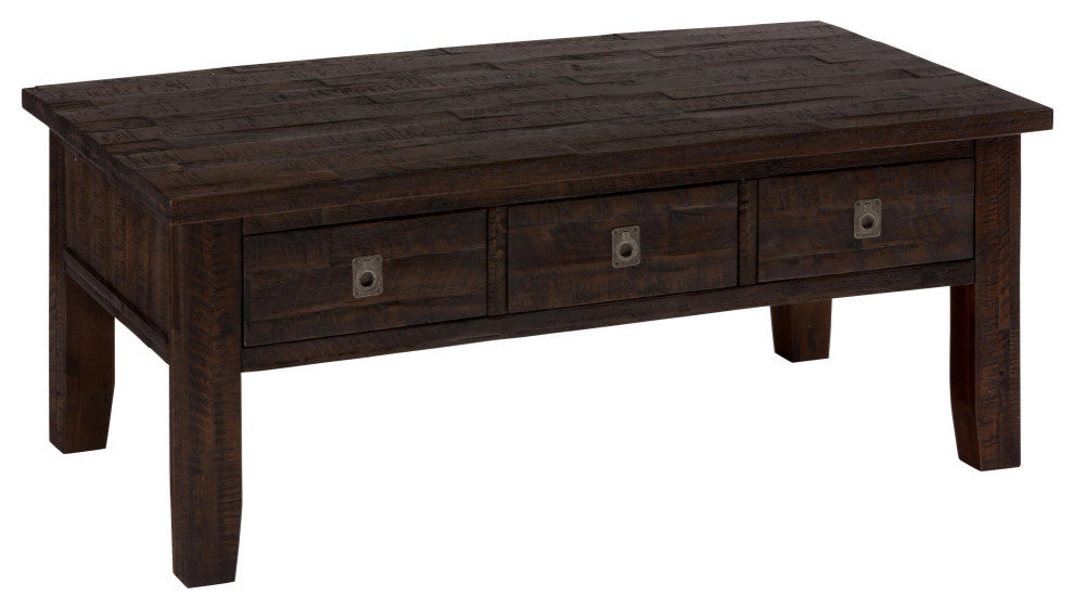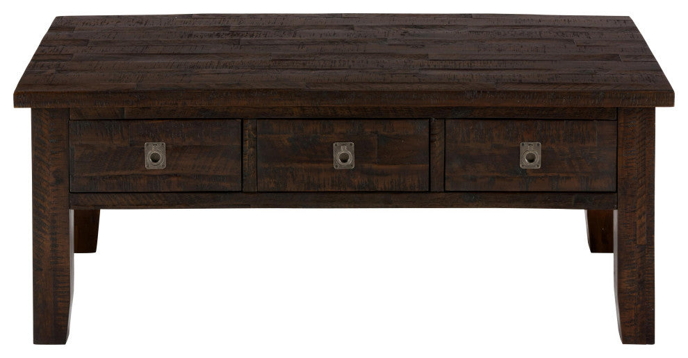 Kona Grove Rectangle Cocktail TableJofran is proud to present our Kona Grove Collection. Reminiscent of tropical getaways and breezy lanais, the warm finish of this collection offers a unique style element to your living space. Product Dimensions: 48"W X 26"D X 19"HKona Grove Finish: Rustic, deep chocolate finish with light distressing.Coordinates with any piece from our Kona Grove collection- occasional, dining, and media and home storage.Three pull through drawers for easy storage and accessCasteredDrawer Dimensions: 11.5"Wx22"Lx3.5"D10" from the ground to the bottom of the tableFor residential use only