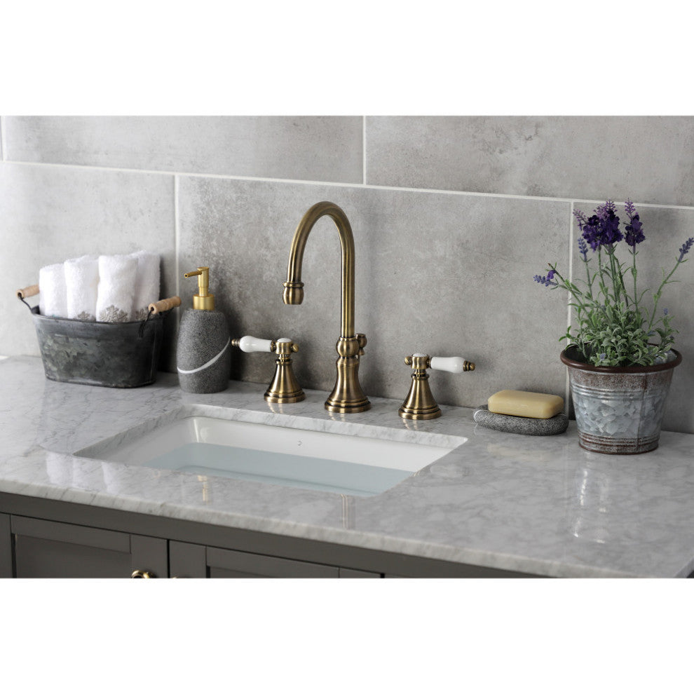 The graceful elegance of timeless design is beautifully merged between British flair and Victorian delicacy within this faucet''s white porcelain levers. Ideal for more spacious bathrooms, widespread faucets are more spread apart and feature a 3-hole installation. The Bel-Air widespread bathroom faucet with brass pop-up and its featured sturdy brass construction and premium antique brass finish are guaranteed to glamorize your home''s traditional ensemble for years to come. Varnish your bathroom with this state-of-the-art fixture. A matching finish drain is also included.