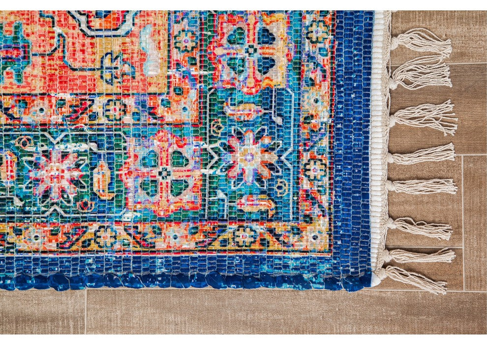 Mesmerizing color paired with perfectly distressed geometric motifs redefine the antique carpet trend in this handwoven area rug. Saturated with bold purples, blues, and oranges, this piece will illuminate any room. Soft polyester fibers bring both comfort and function into your favorite rooms. Let it stand up to heavy foot traffic in your living room or family room or lay it down to add some lush texture to your dining room. However you choose to style it, you''ll love the way its brilliant colors enliven any room.