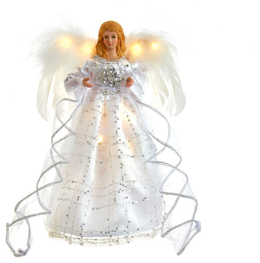 This 10-Inch Battery-Operated Silver and White Fairy Lighted Angel Tree Topper from Kurt Adler is a beautiful addition to your holiday decor or Christmas tree. She is wearing a stunning white dress with silver sequined accents with beautiful white feathered wings. This treetop runs on 3 AA batteries and has a timer for your convenience.