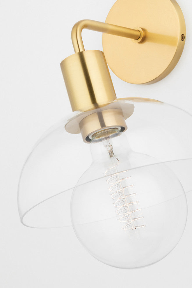 Globe peek from beneath dome glass shades to give this sleek fixture a vintage vibe. Light shines through the clear glass shade of the sconce.