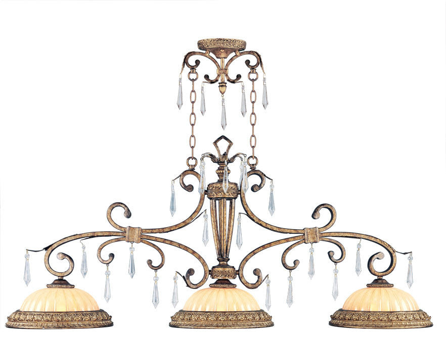 A neoclassical influence is merged with the glamour of high fashion in this beautiful linear chandelier. The exquisite look features generous scrolls topped with a warm glow from the hand crafted gold dusted glass shades. K9 crystal accents further decorate the intricate frame which comes in a rich vintage gold leaf finish.