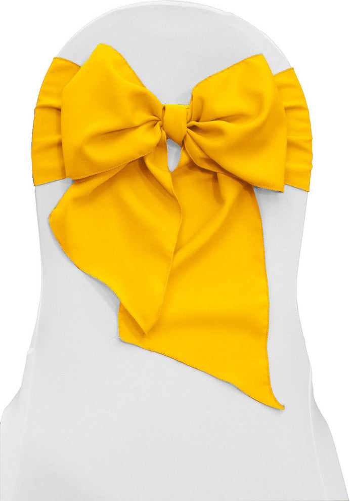 LA Linen Pack of 10 Polyester Poplin Chair Bows 8 by 108-Inch, Dark YellowOur poplin sashes are made with a high grade 100% Polyester Poplin. These sashes measure 8" x 108", you can create a beautiful bow or a simple knot. They are angle cut and the edges are serged for a clean and classy look. These bows will actually soften and improve with repeated washings, and the colors will retain the vibrant colors throughout the years.100% Premium Quality Polyester PoplinMade in USASerged Edge for a Clean Look.Stain and wrinkle resistance; Can withstand various cleaning chemicals while maintaining it''s elegant look through over 75+ wash cyclesColor fasted, 7 oz. weight making it one of the most durable fabrics for event linens. Cold Machine, Tumble Dry Low, Low IronPack of 10 Angle cut Chair Bow Sashes The sashes come folded and untied and the chair is not includedThe digital images we display have the most accurate color possible. However, due to differences in computer monitors, there may be variations in color between the actual product and your screenProduct Dimension (WxDxH) inches: 8 x 108