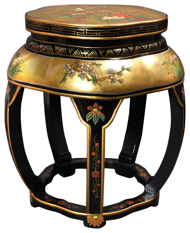 Hand-crafted by artisans in the Guangdong province of mainland China, this lacquered stool has five legs and a unique, rounded shape inspired by Chinese craftsmanship of the 18th Century. Each stool has been hand-painted with traditional Asian scenes and finished in a rich, clear lacquer. Use this stand to display your favorite plant or objet d''art, or simply present it on its own as a lovely and functional accent for any room.