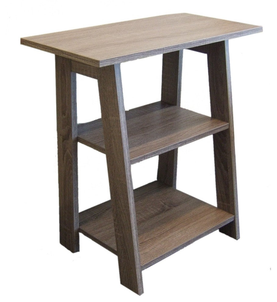 A LampsUSA EXCLUSIVE! LampsUSA has established a reputation for providing the best trend-right products with innovative designs at the right price, while offering quality, functionality, and stylish furnishings for every room in your home. Declutter your space and organize your favorite items with this ladder chairside table. It takes a form and shape we know and updates it to make a functional and fashionable piece of furniture, adding beauty and convenience to any room. Ideal next to your sofa, favorite chair, as a night stand or in a corner where you need to make the best use of space. Two shelves plus a top platform allows for maximum storage capacity and its open design allows for easy access from all sides. The attractive Rustic Grey finish is modern yet elegant and the sturdy wooden construction will provide long-term support. The sloped front adds stylish punctuation to this already useful yet attractive piece. Rustic Grey Finish Unique ladder design with sloped front Contemporary modern style 2 organizing shelves for books, knick knacks and magazines Dimensions: 23.5 Height x 23 Width x 13 Depth Middle Shelf: 10 Depth Bottom shelf: 12 Depth For storage and display purposes only, (14 lb. weight capacity) not to be used for seating or climbing Some simple assembly required Assembly Instruction