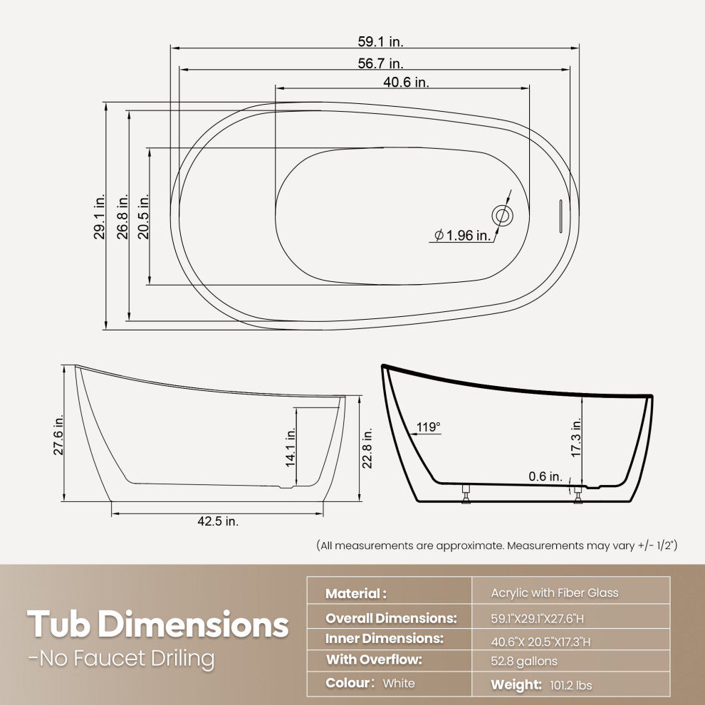 Ready to upgrade your bathing experience? Our luxurious Lahore Series Bathtub redefines the art of relaxation. Crafted from ultra-durable materials for unmatched longevity, the Lahore has a modern oval design that enhances any bathroom aesthetic. Its ergonomic shape allows you to recline comfortably for extended soaks, while its solid walls trap heat to keep your water warm and cozy. The smooth, non-porous surface resists scratches and stains, ensuring effortless cleaning and lasting beauty.FeaturesSolid acrylic and fiberglass construction provides long-lasting durability. Elegant oval design with thoughtful drain placement lends a fresh, modern look. Generous capacity at 52.8 gallons and 13" water depth, allowing for deep immersion. Crisp, bright-White finish complements any bathroom color scheme.Ergonomic design cradles the body, providing excellent lumbar support for long soaks.Thick walls provide exceptional heat retention to keep the water warm for longer.Smooth, non-porous finish is easy to clean and highly resistant to scratches, cracks, and stains. Chrome-finish brass pop-up drain removes water quickly and effortlessly.Choose from 2 convenient sizes to fit your space and needs perfectly. Overflow groove outcut (without cover) prevents tub overflow.Flexible drain hose ensures fast, easy installation. Self-leveling legs provide added stability on rough or uneven flooring. Multi-layer tub materials are environmentally friendly.CUPC-certified, confirming this tub meets stringent quality standards.• Freestanding faucet not included