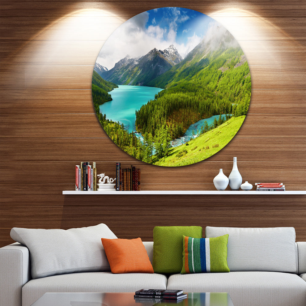 Bring Contemporary Abstraction to your home with this large Circle Metal wall art. This Lake amidst Lush Greenery Metal Artwork makes it the focal point of any room or office.