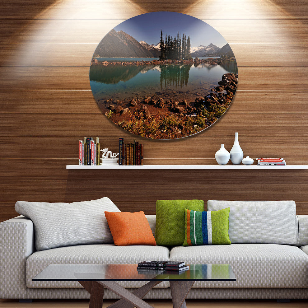 Bring Contemporary Abstraction to your home with this large Circle Metal wall art. This Lake and Pine Trees in Evening Metal Artwork makes it the focal point of any room or office.