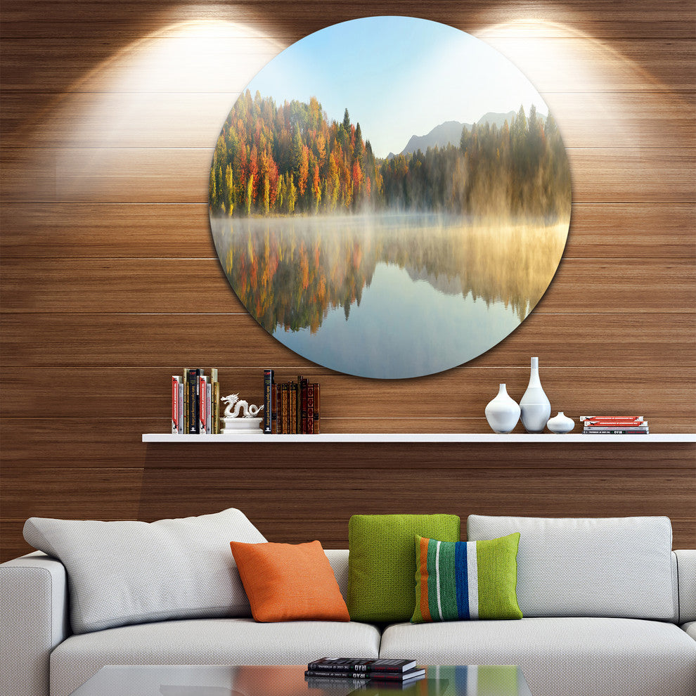 Bring Contemporary Abstraction to your home with this large Circle Metal wall art. This Lake Autumn Foliage Fog Panorama Metal Artwork makes it the focal point of any room or office.